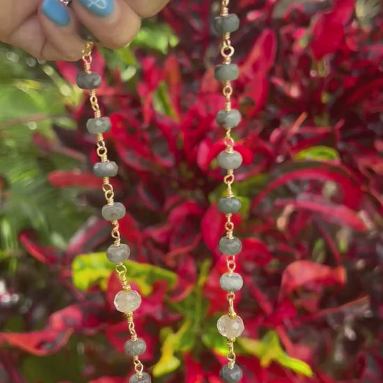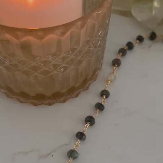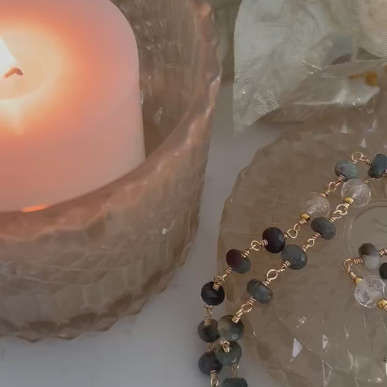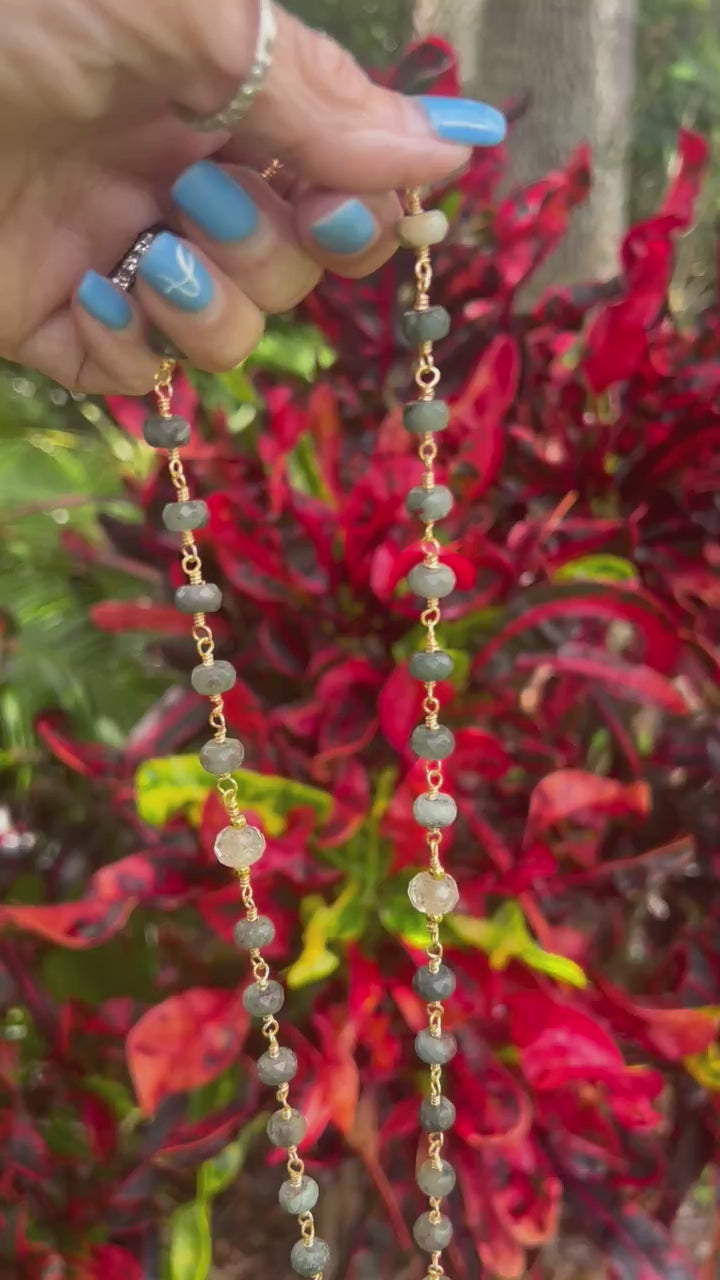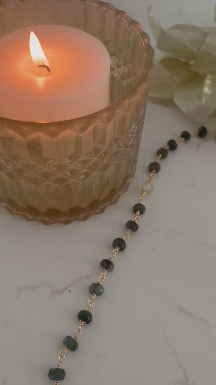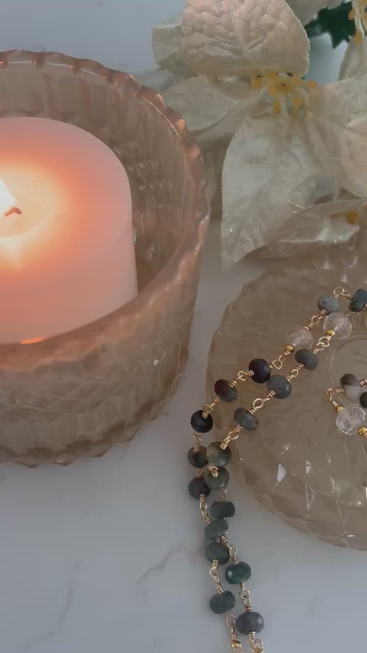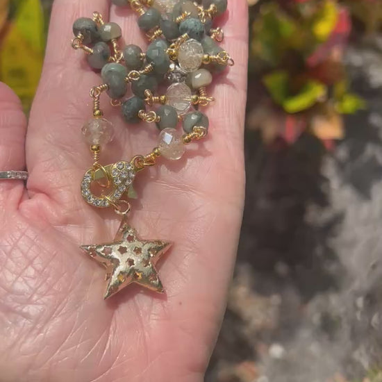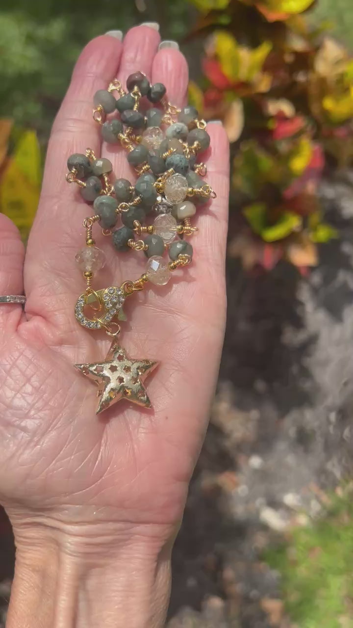 This rosary style necklace features 6-7 mm faceted Bloodstone with 8-9 mm Faceted Gold Glitter Glass.22 gauge goldtone artistc wire used to meticulously wire wrap each bead.The star pendant and gold beads are 18 kt gold plated. The pendant measures 1.5 inches. The gold rhinestone clasp measures .75 inches.The necklace measures 24 inches in length before the addition of the pendant.