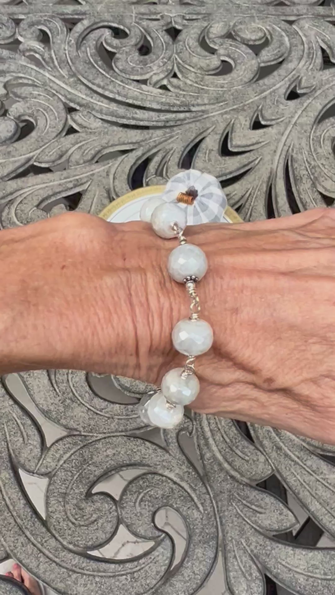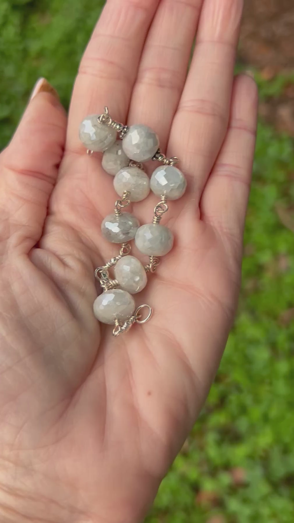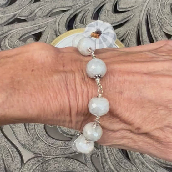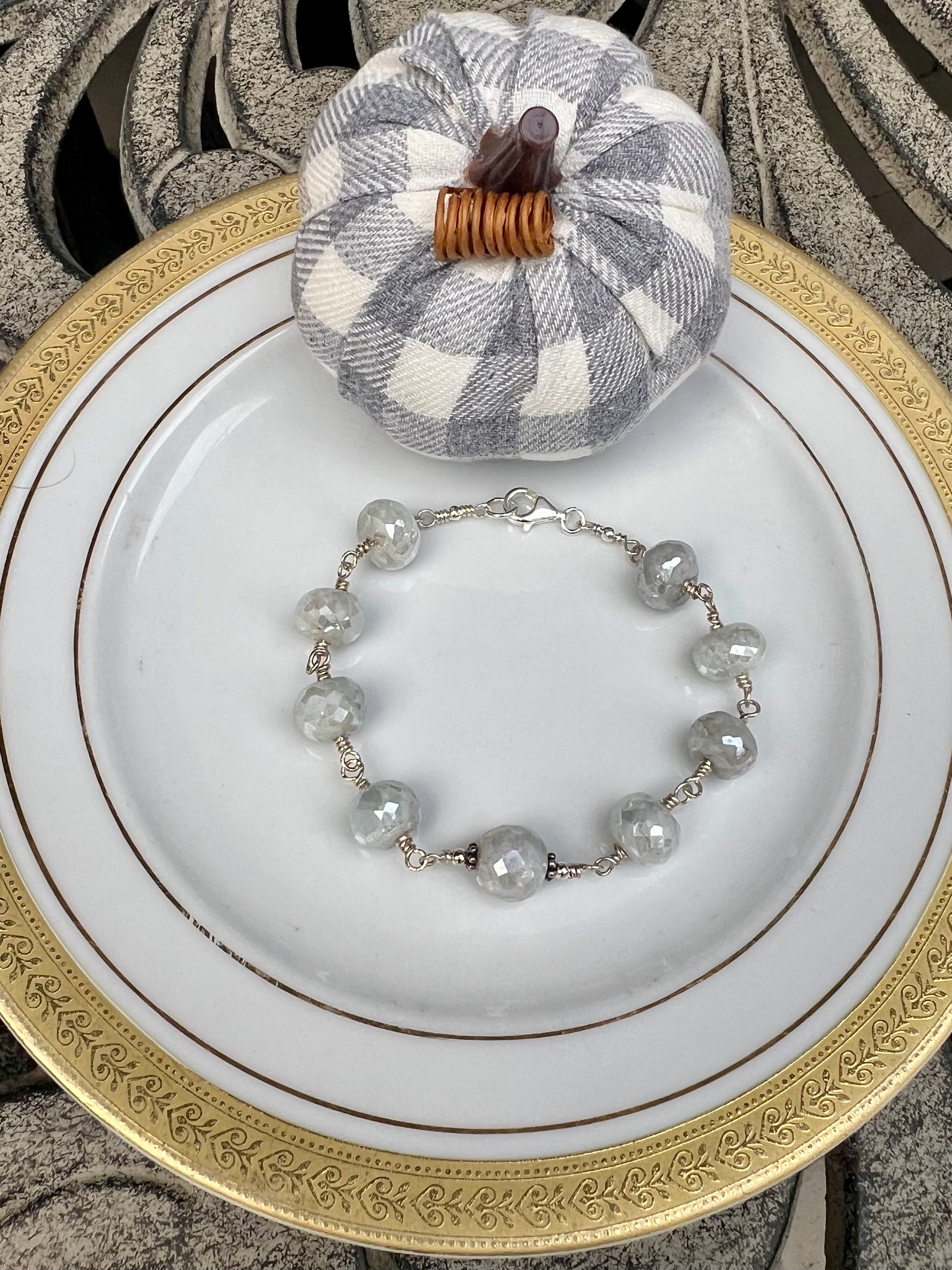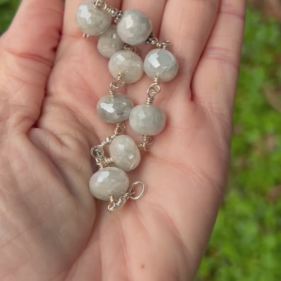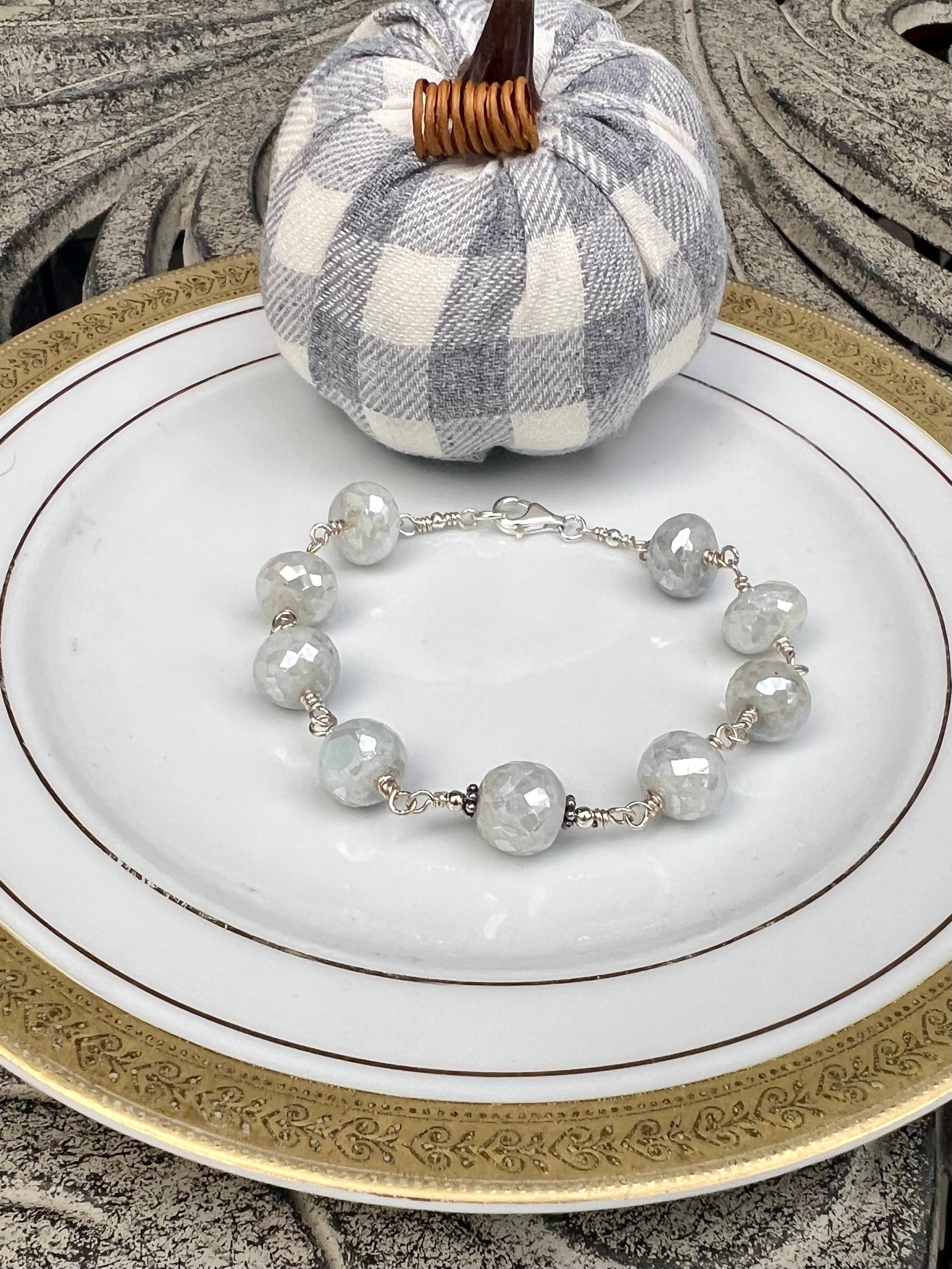 This chunky moonstone bracelet is made with 8-9 mm AB coated faceted rondelle beads. They have such a magnificent luster to them and are so chunky-licious!!! The beads are wire wrapped using 925 sterling silver wire. All the findings are 925 sterling silver. A nice size lobster clasp is used to secure the bracelet in place.