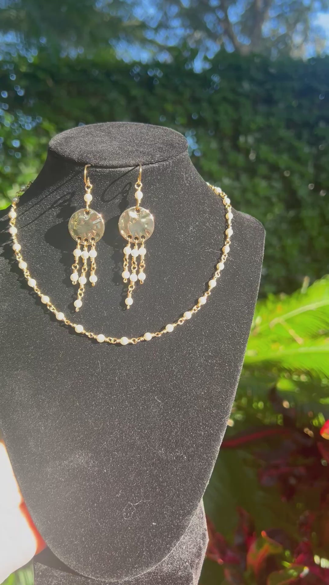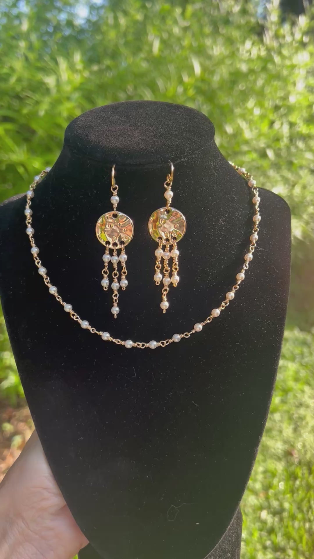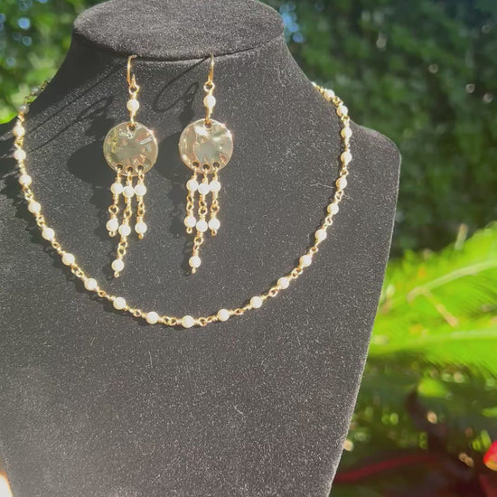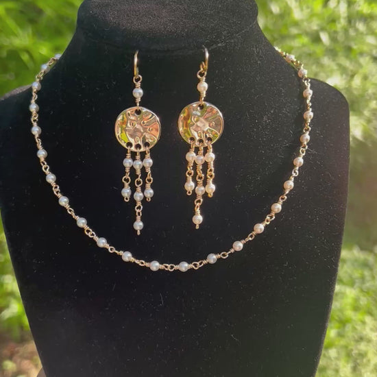 Wire wrapped Preciosa Crystal pearl beads 4 mm using gold tone artist wire that is tarnish resistant. A beautiful delicate choker necklace measuring 14-16 inches. Perfect for layering and elegant to be worn alone. Matching gold tone dangle earrings will give that extra statement to this set. The earrings sway as you move just enough to male their presence known. The earring measure about 2.5 inches and are lighweight.
