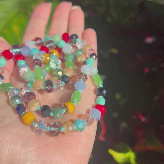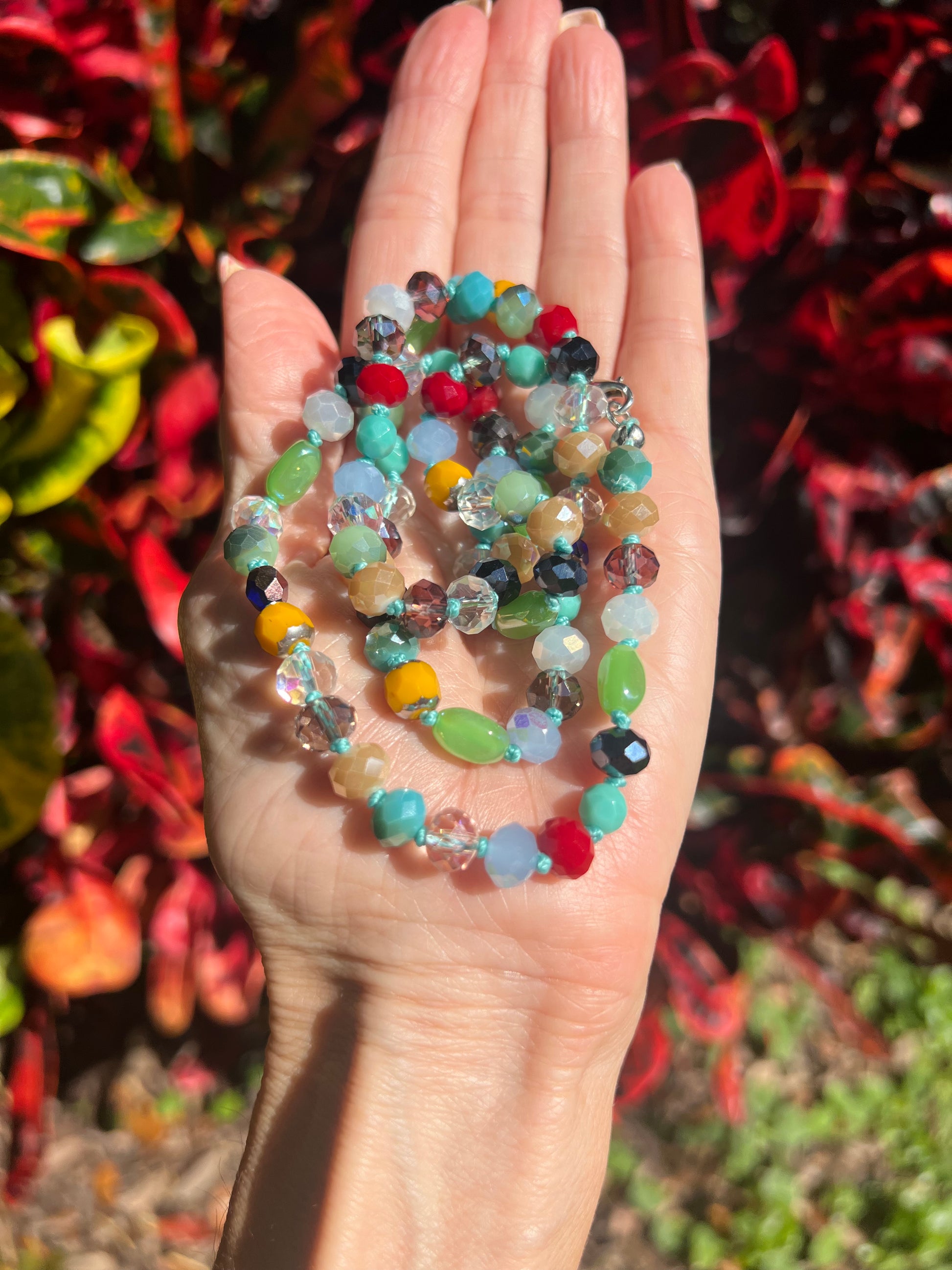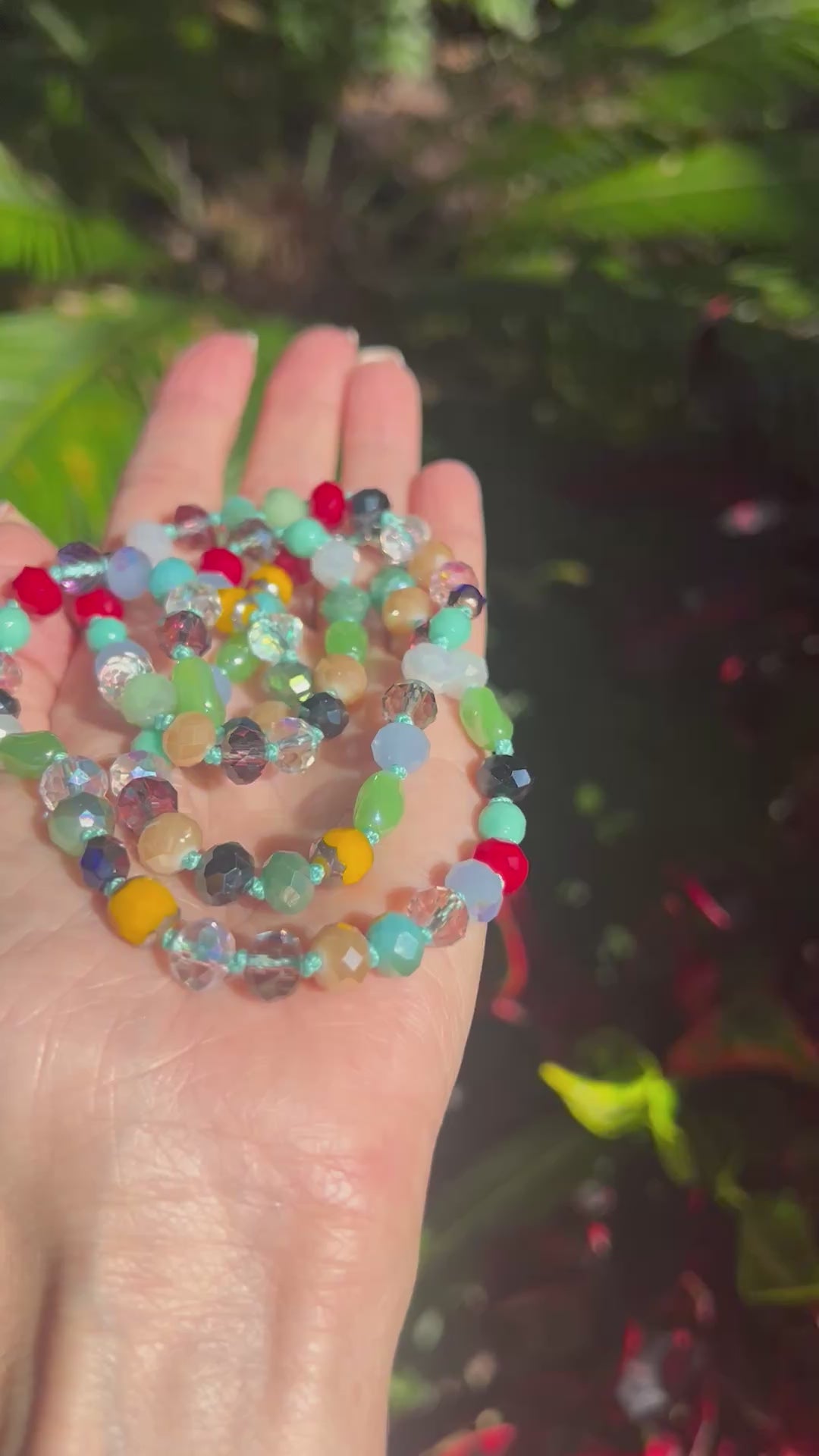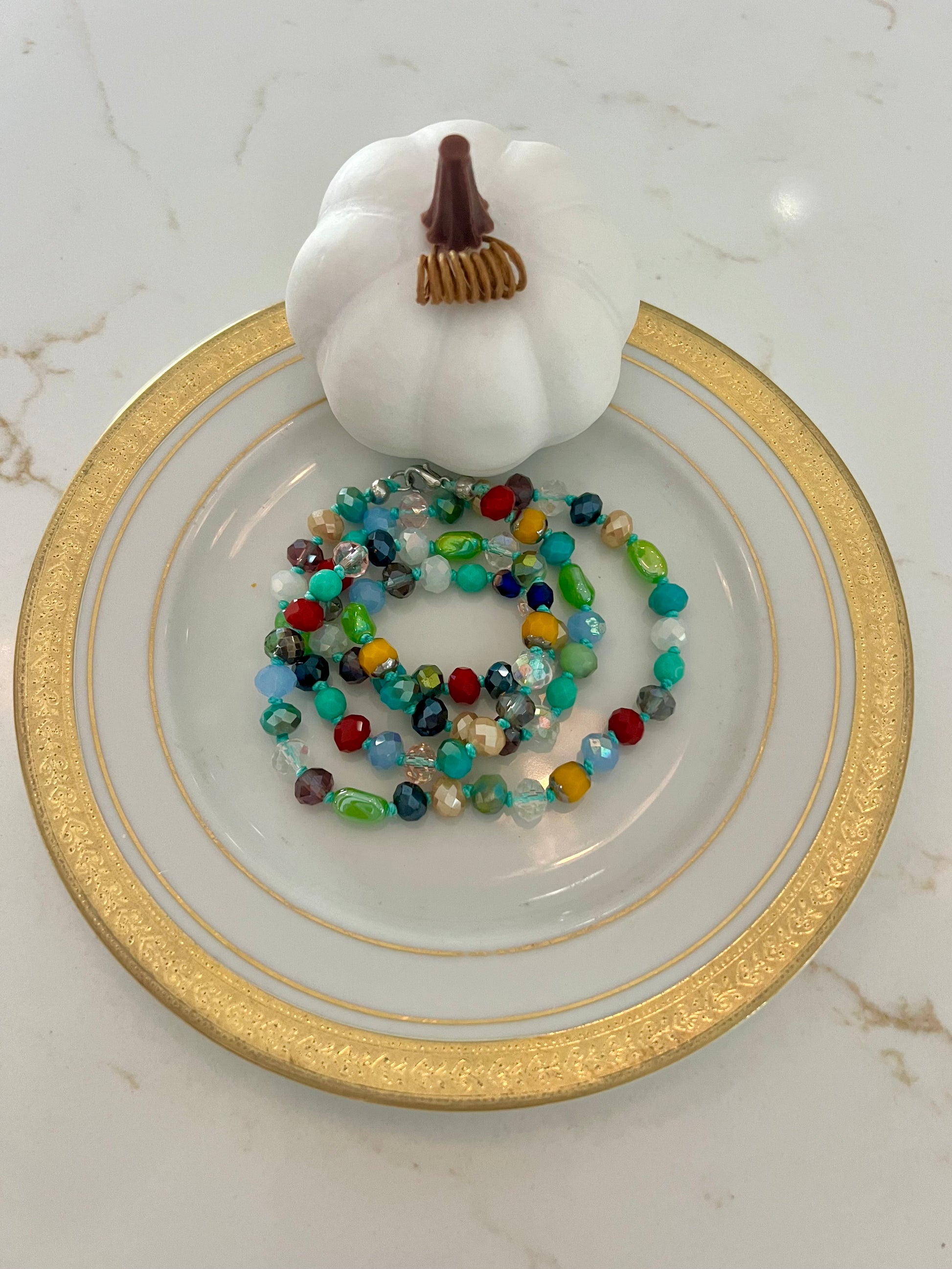 This glorious strand of glass beads is perfect for any occasion! It brings love, happiness and light to any outfit! It’s fun and trendy and makes just the right statement. It is 27” in length and can be worn as a necklace either solo or layered. It can also be wrapped around your wrist and worn as a funky bracelet. It is shown on a small wrist size 6.5 inches and it is wrapped comfortably 4 times.