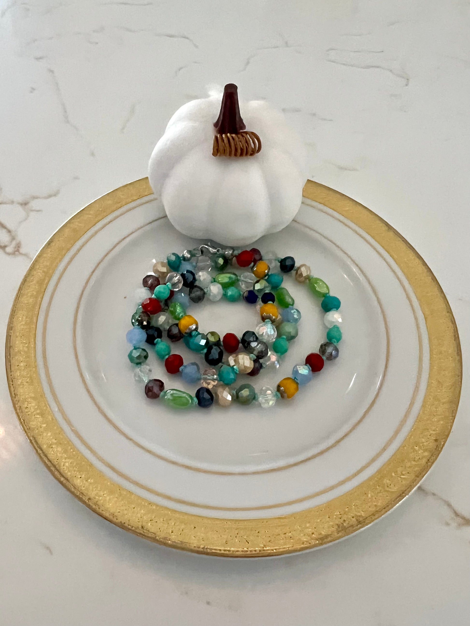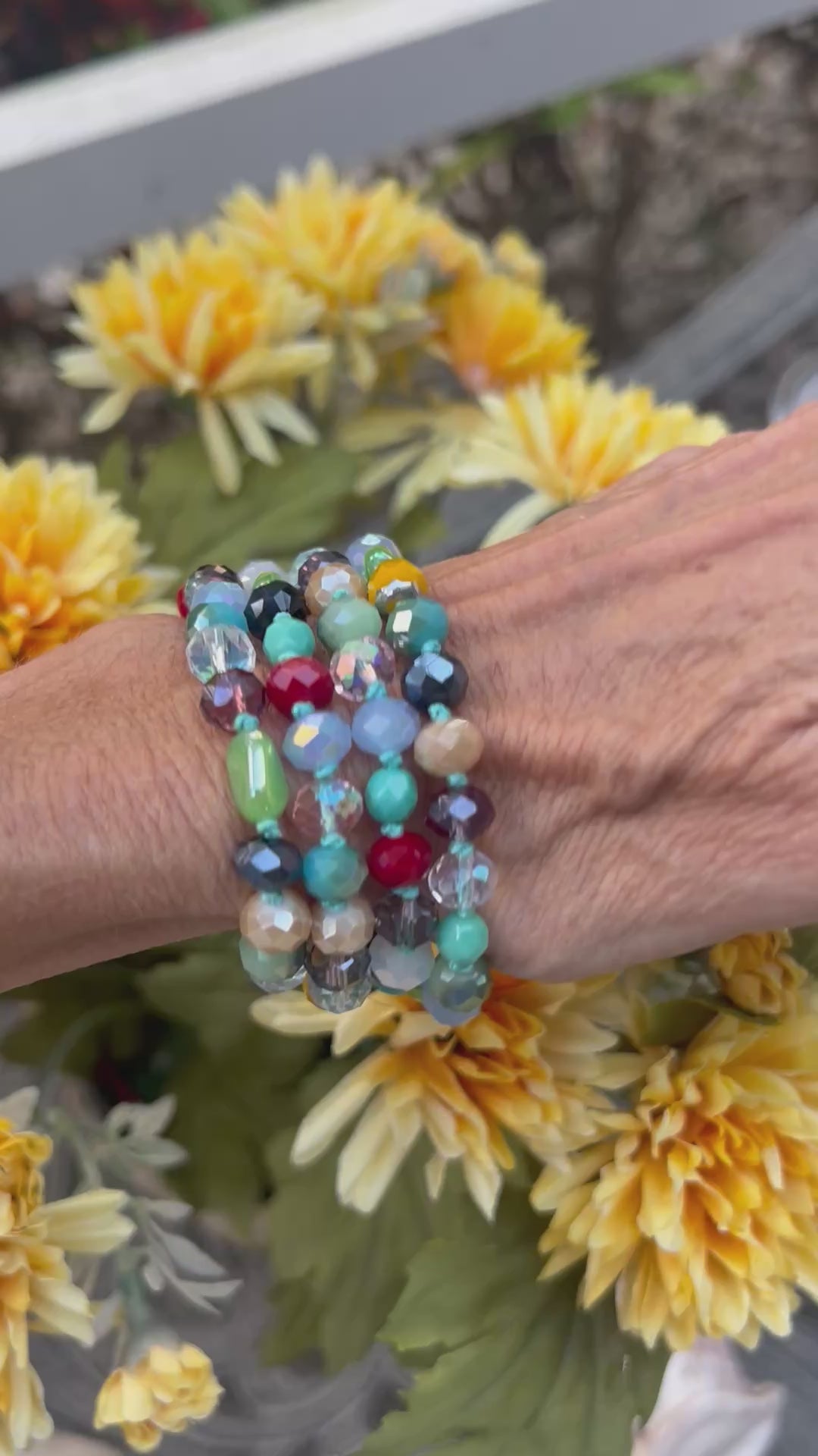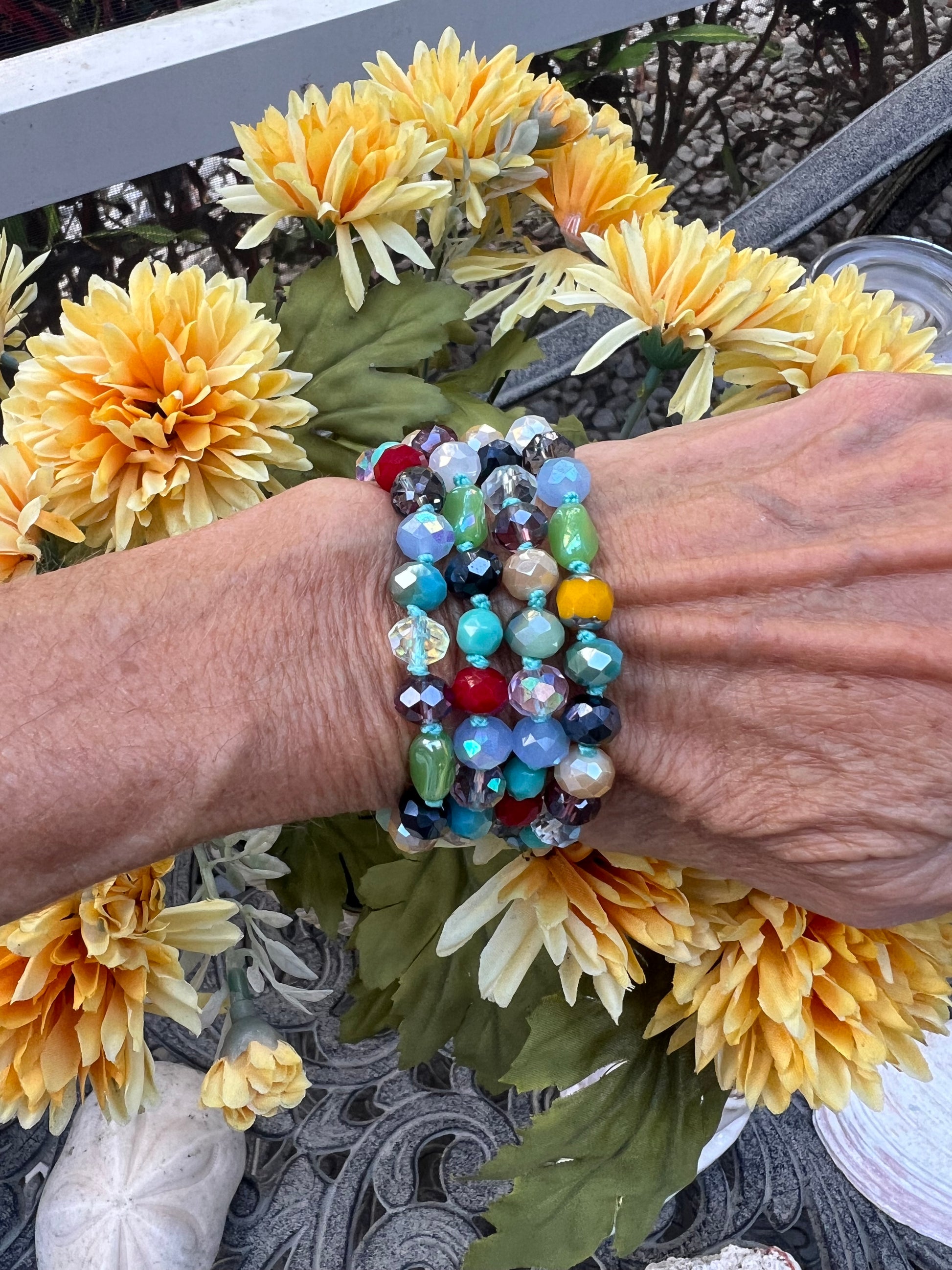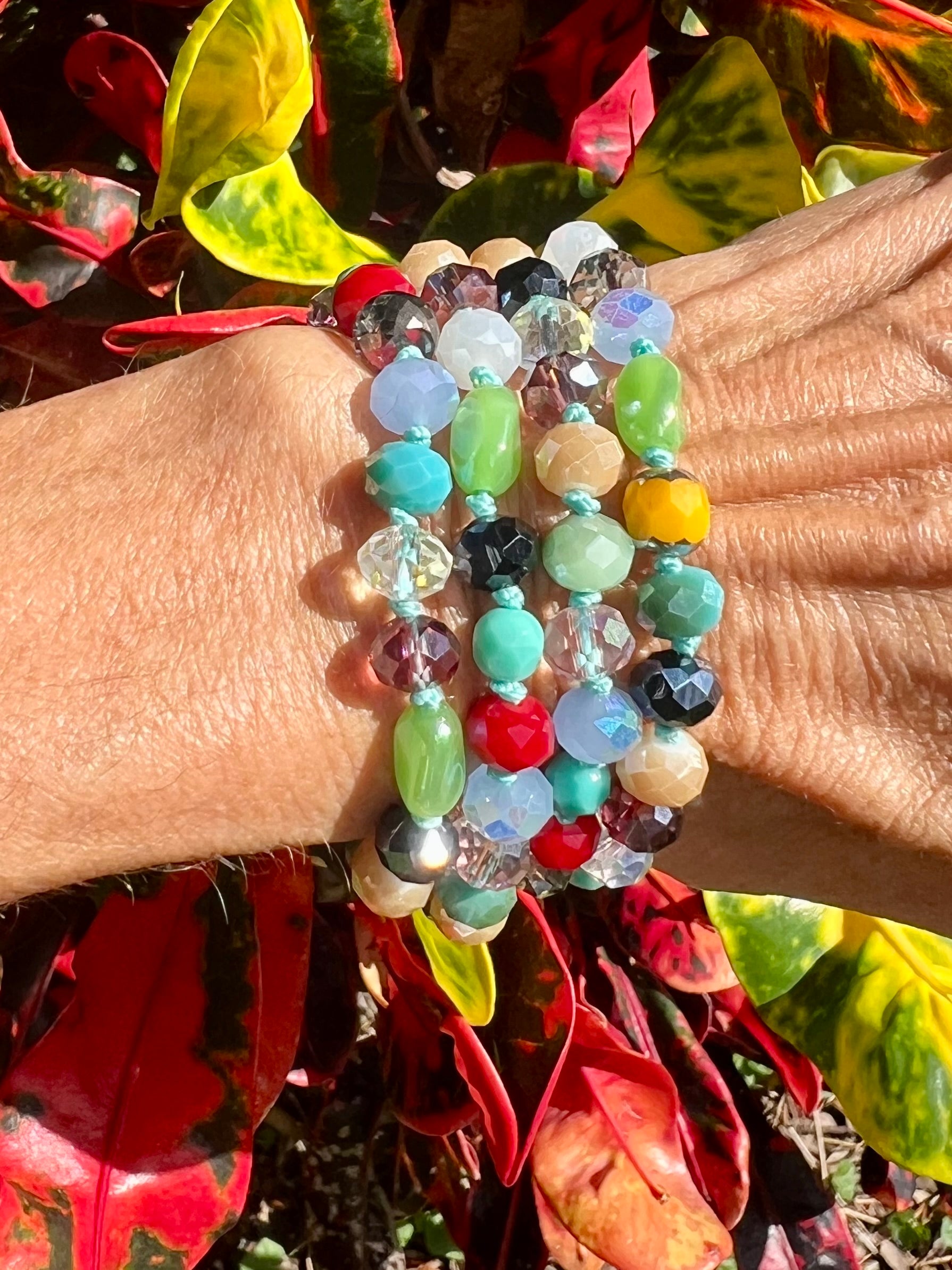 This glorious strand of glass beads is perfect for any occasion! It brings love, happiness and light to any outfit! It’s fun and trendy and makes just the right statement. It is 27” in length and can be worn as a necklace either solo or layered. It can also be wrapped around your wrist and worn as a funky bracelet. It is shown on a small wrist size 6.5 inches and it is wrapped comfortably 4 times.