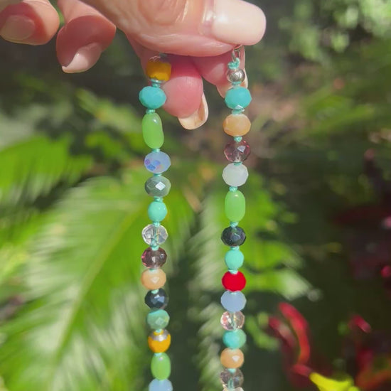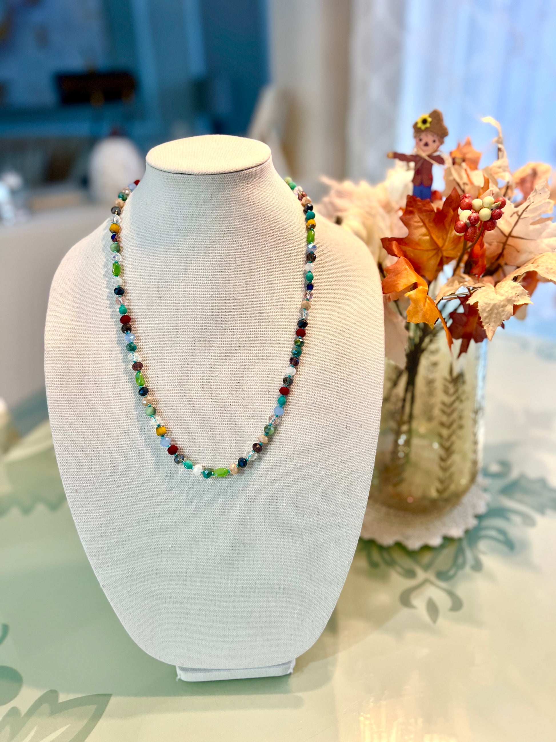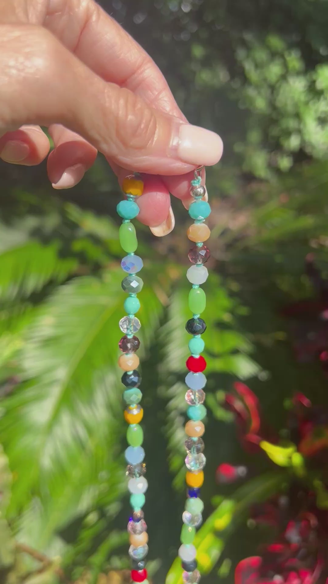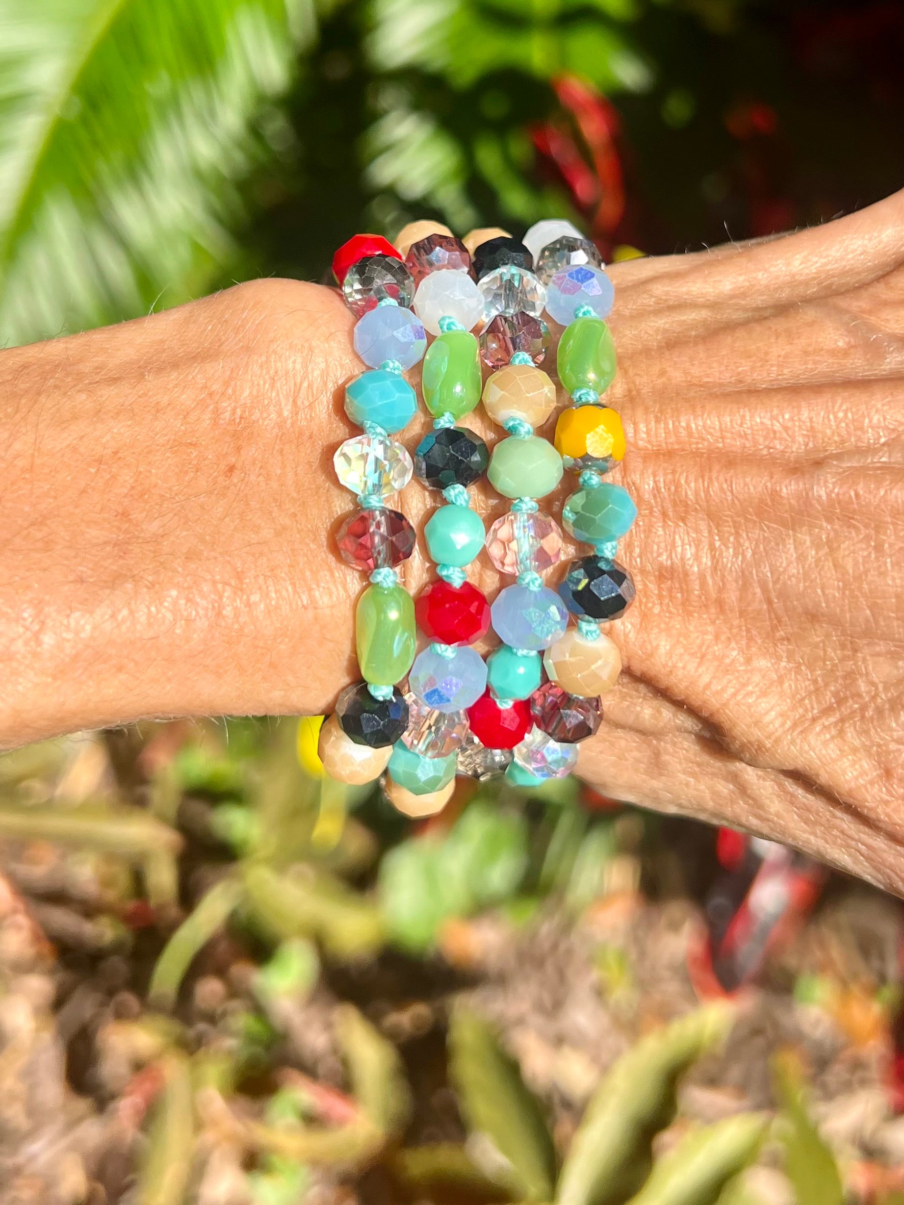 This glorious strand of glass beads is perfect for any occasion! It brings love, happiness and light to any outfit! It’s fun and trendy and makes just the right statement. It is 27” in length and can be worn as a necklace either solo or layered. It can also be wrapped around your wrist and worn as a funky bracelet. It is shown on a small wrist size 6.5 inches and it is wrapped comfortably 4 times.